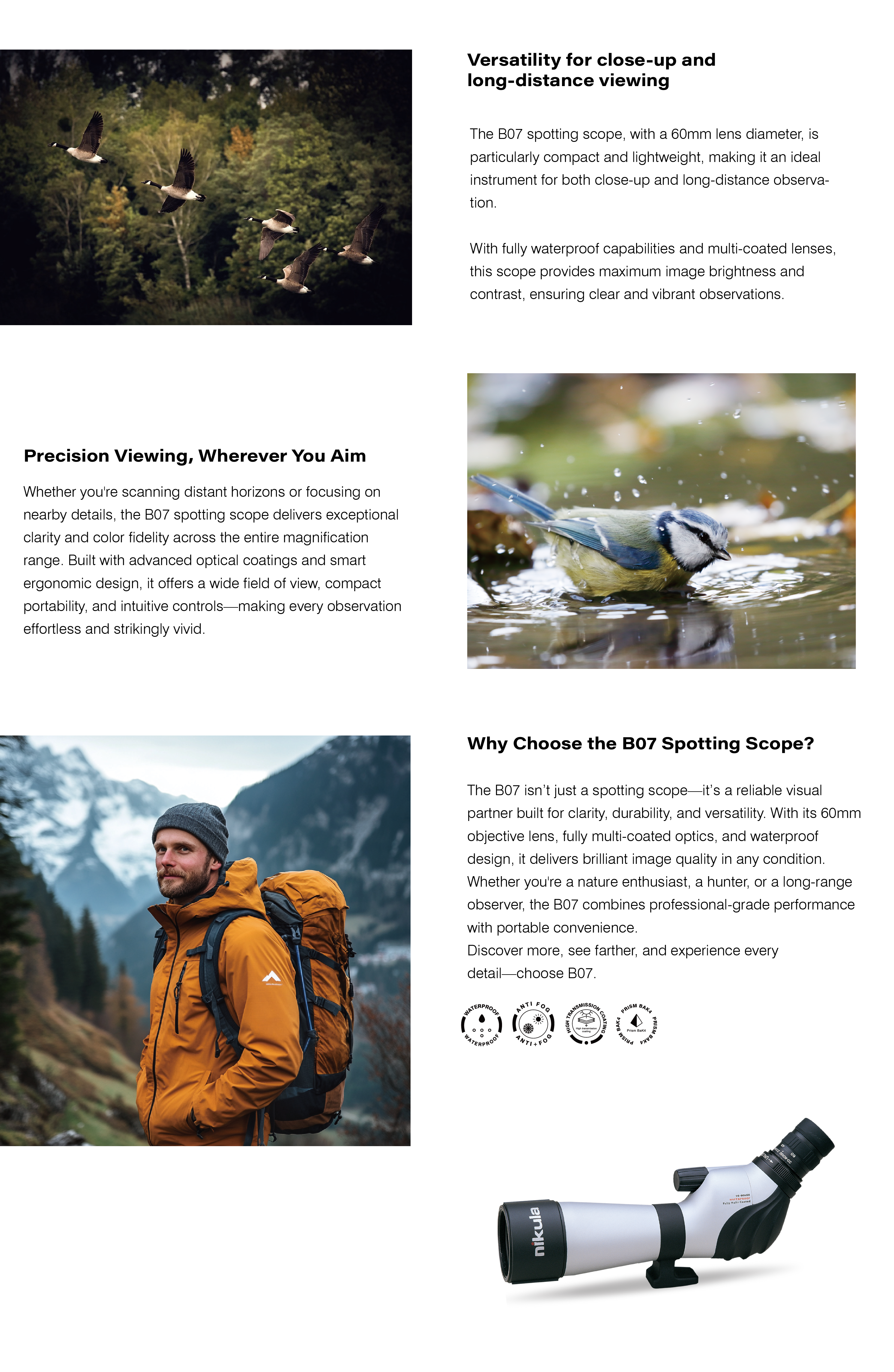 The B07 Spotting Scope, With a 60mm Lens Diameter, Is Particularly Compact and Lightweight. Features: . Fully multi-coated optics to produce sharp image . Bak4 porro prisms for intense color and contrast . Stay-on soft cover for maximum protection . Nitrogen purged-waterproof