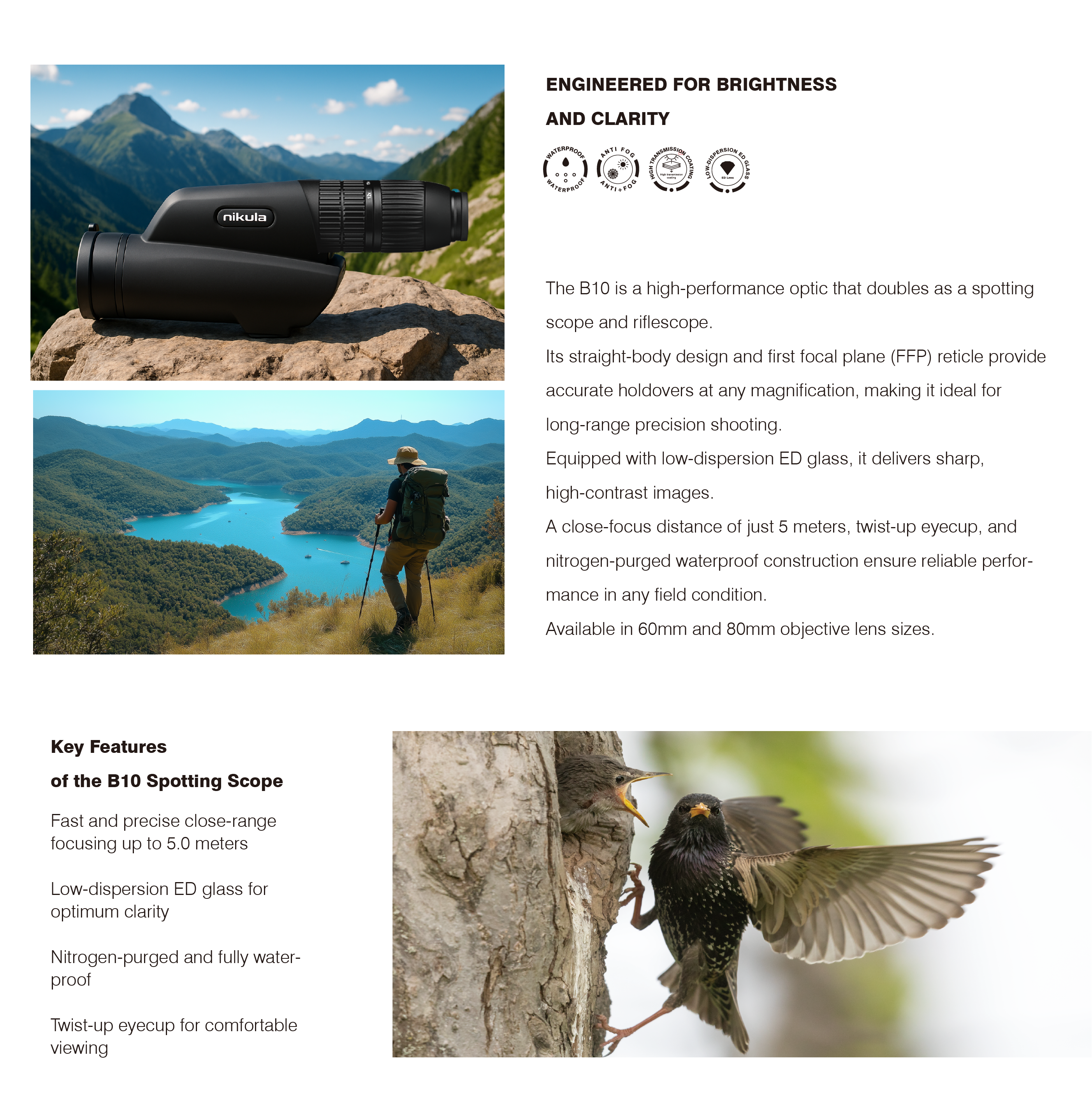 B10 Can Be Used As a Riflescope. It Is Straight and Has a 1st Focal Plane Reticle, Which Is Very Popular Among Shooters Features: . Low-dispersion ED GLASS for optimum clarity . Fast and precise close range focusing up to 5.0 meters . Twist-up eyecup